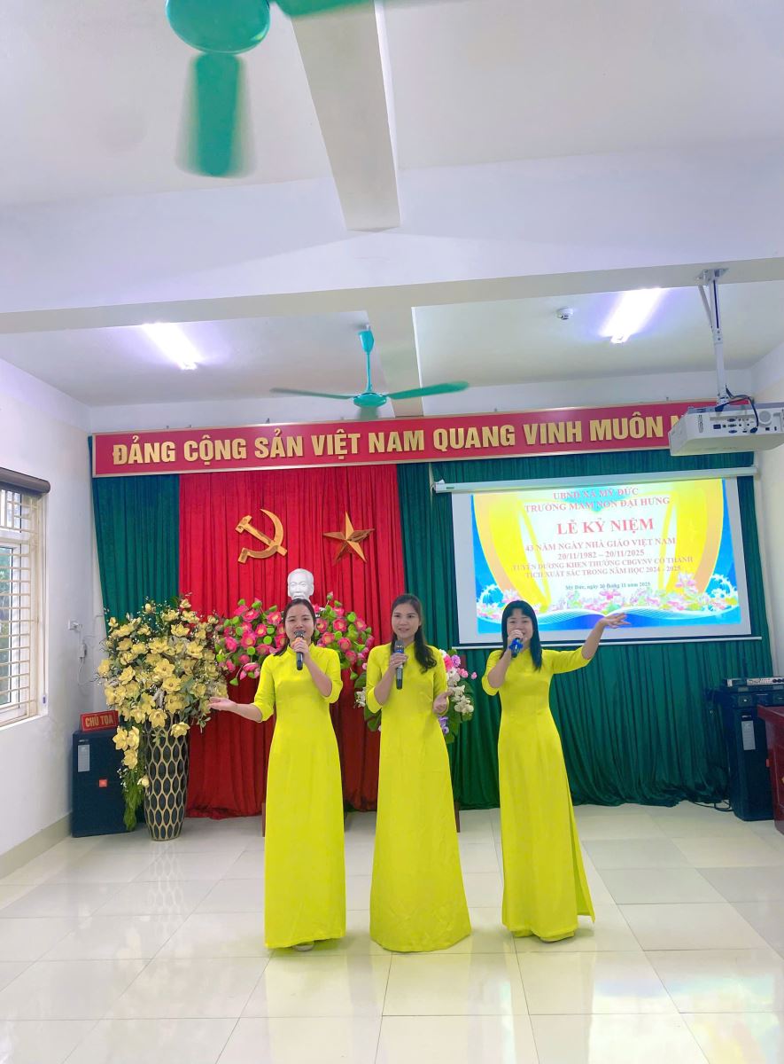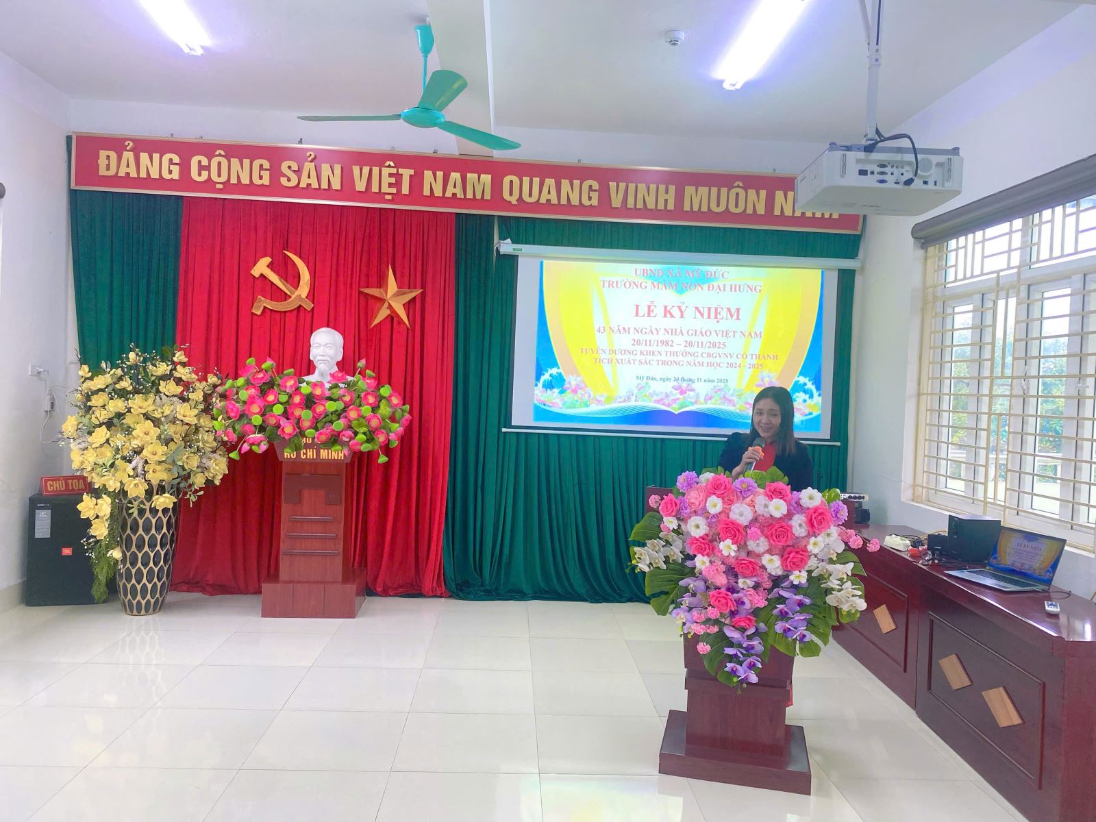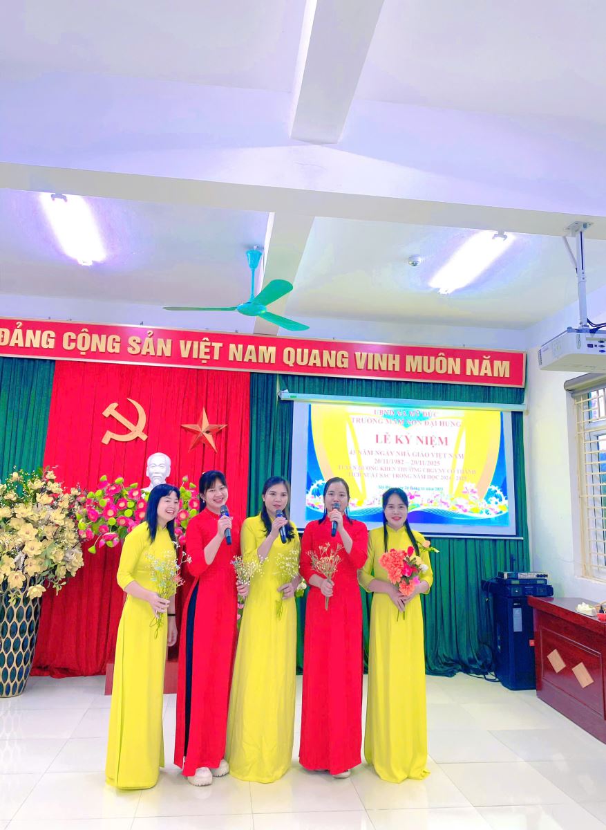 21/11/2025 A- A A+ | Trường mầm non Đại Hưng tổ chức lễ chào mừng ngày Nhà giáo Việt Nam 20/11 Xem Chia s? Hòa chung không khí hân hoan của cả nước hướng về Ngày Nhà giáo Việt Nam (20/11), Trường Mầm non Đại Hưng đã long trọng tổ chức buổi Mít tinh kỷ niệm 43 năm Ngày Nhà giáo Việt Nam (20/11/1982 – 20/11/2025). Đây là dịp để toàn thể cán bộ, giáo viên, nhân viên nhà trường cùng nhau ôn lại truyền thống tôn sư trọng đạo cao đẹp và tri ân những cống hiến thầm lặng của đội ngũ người làm giáo dục. 1. 💖 Tôn Vinh Tấm Lòng Người Gieo Mầm Ước Mơ Buổi lễ diễn ra trong không khí trang trọng và ấm áp với sự tham dự của: • Ban Giám hiệu nhà trường • Toàn thể cán bộ, giáo viên, nhân viên Trường Mầm non Đại Hưng • Đại diện Ban Đại diện Cha mẹ học sinh Phát biểu tại buổi lễ, Bà Nguyễn Thu Hà- Hiệu trưởng, đã ôn lại truyền thống vẻ vang của ngành giáo dục Việt Nam và khẳng định vai trò quan trọng của giáo viên mầm non. Bà nhấn mạnh: “Các cô giáo mầm non chính là những người mẹ thứ hai, những người đặt viên gạch đầu tiên xây dựng nhân cách và trí tuệ cho các con. Mỗi nụ cười, mỗi bước tiến của các con đều là phần thưởng vô giá và là động lực để chúng ta tiếp tục cống hiến.” 2. 🎁 Tri Ân – Ghi Nhận Những Đóng Góp • Tuyên dương và Khen thưởng: Ghi nhận những giáo viên, nhân viên có thành tích xuất sắc trong công tác chăm sóc, nuôi dưỡng và giáo dục trẻ trong năm học vừa qua. • Phát biểu tri ân: Đại diện Ban Đại diện Cha mẹ học sinh đã gửi lời cảm ơn chân thành và những bó hoa tươi thắm, thể hiện sự tin tưởng và tri ân sâu sắc đến tập thể sư phạm nhà trường. 3. 🎨 Những Món Quà Tinh Thần Đầy Ý Nghĩa Phần sôi động và đáng yêu nhất của buổi mít tinh chính là các tiết mục văn nghệ đặc sắc do chính các cô giáo và các bé mầm non biểu diễn: • Tiết mục của giáo viên: Tập thể giáo viên nhà trường đã thể hiện ca khúc : Người gieo mầm xanh, Bài ca người giáo viên nhân dân, mang đến một không khí vừa xúc động, vừa nhiệt huyết. 🎉 Lời Hứa Tiếp Nối Buổi Mít tinh kỷ niệm Ngày Nhà giáo Việt Nam 20/11 của Trường Mầm non Đại Hưng Trừ đã khép lại trong niềm hân hoan và sự ấm áp. Đây không chỉ là hoạt động tri ân mà còn là dịp để mỗi cán bộ, giáo viên tiếp thêm động lực, củng cố ý chí để không ngừng nỗ lực, nâng cao chuyên môn, hết lòng vì sự nghiệp “trồng người”. Tập thể Trường Mầm non Đại Hưng Trừ xin gửi lời chúc tốt đẹp nhất đến tất cả các nhà giáo, chúc các thầy cô luôn dồi dào sức khỏe, hạnh phúc và gặt hái được nhiều thành công hơn nữa! Dưới đây là hình ảnh của buổi lễ Tập tin đính kèm Tải về